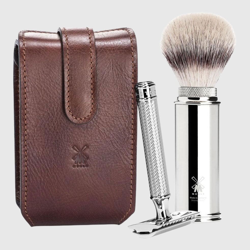 Travel kit from Mühle containing a R89 razor, a synthetic travel brush, a blade guard and a hand made leather pouch to keep it all secure.